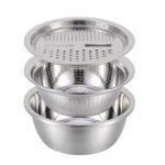 Upgrade your kitchen with this 3-in-1 stainless steel slicer set, featuring a fine strainer, basin, and julienne peeler. Flawless for slicing vegetables and fruits like potatoes, cucumbers, and carrots, it also serves as a grater, mandoline, and chopper. Made from Quality, food-grade stainless steel, it’s dishwasher-safe, durable, and easy to clean. Ideal for making healthy veggie noodles, salads, and garnishes, it simplifies cooking and helps you maintain a tidy kitchen with space-saving storage.