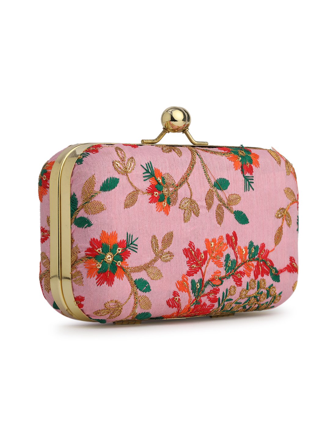Pink & Gold Embroidered Box clutches, Has gold chain shoulder strap, 1 main compartment with twist closure