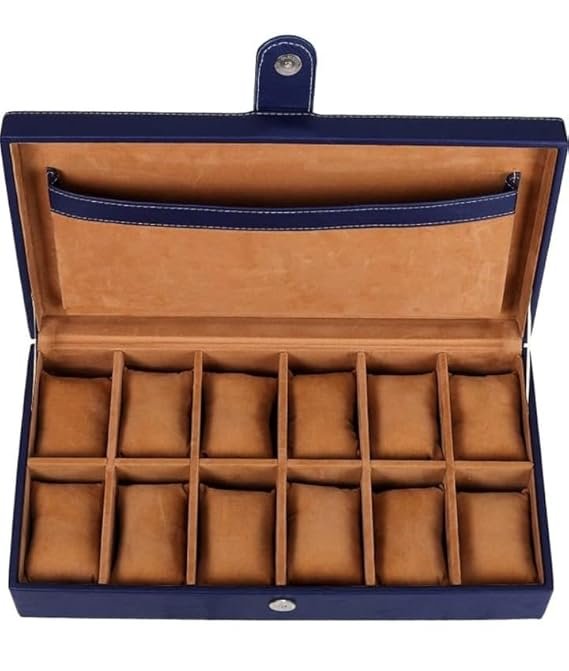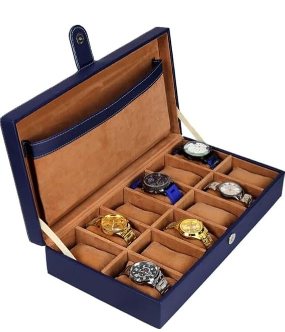 Presents Luxury 12 Slot Watch Box for Men & Women Lockable Leather Watch Organizer with Glass Lid, Soft Velvet Cushions, Premium Display & Storage Case for Watches (Blue)