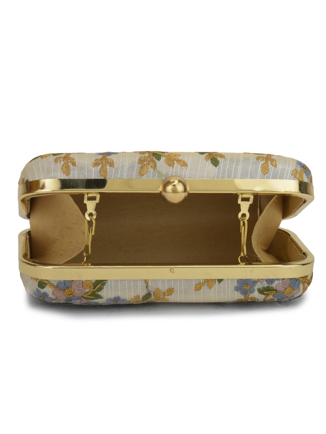White & Gold Embroidered Clutch 1 Main compartment with click closure has detachable shoulder strap